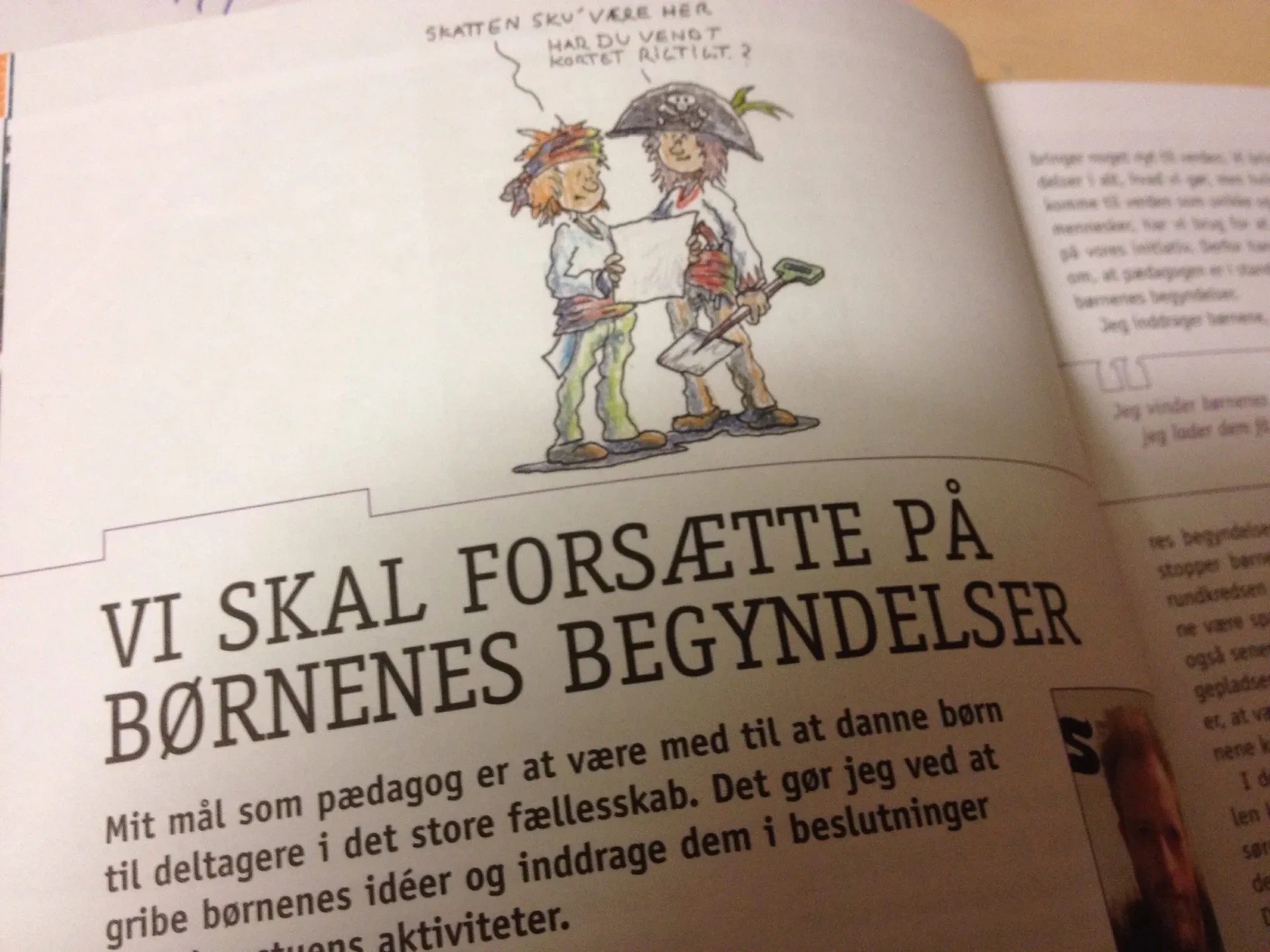 Om Pelle opdager, at jeg har indbygget læring om bogstaver i hans idé om skattejagt, ved jeg ikke. Det vigtigste er, at Pelle, Tjalfe, Alberte og de andre børn kommer til verden i de aktiviteter, vi laver, for så har de også en skærpet opmærksomhed. På den måde bliver medbestemmelsen også mit springbræt til at kunne arbejde med læring og pædagogik i al almindelighed. Jeg vinder børnenes opmærksomhed, fordi jeg lader dem få min opmærksomhed. På den måde forsætter børnene også på mine begyndelser.